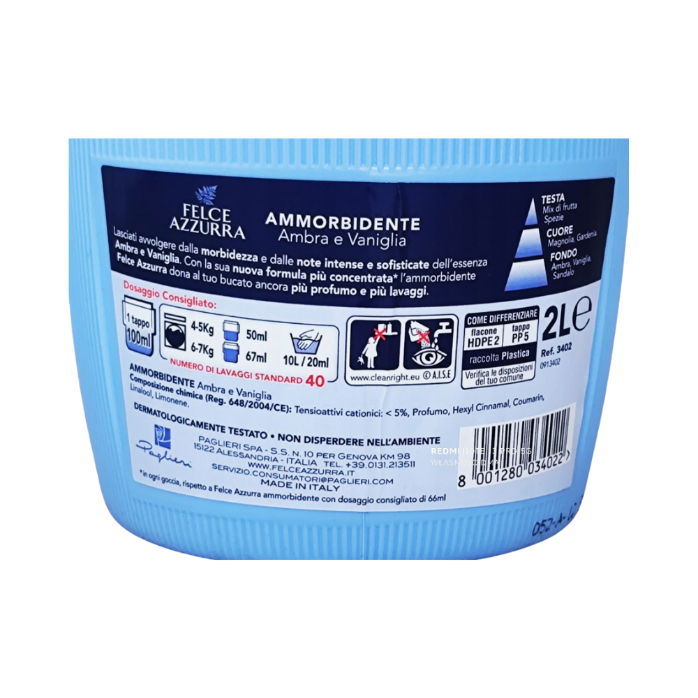- Zmysłowy zapach: Wybierając Felce Azzurra, nie tylko pielęgnujesz swoje ubrania, ale również owijasz je w zmysłowy aromat, który towarzyszy ci przez długi czas.