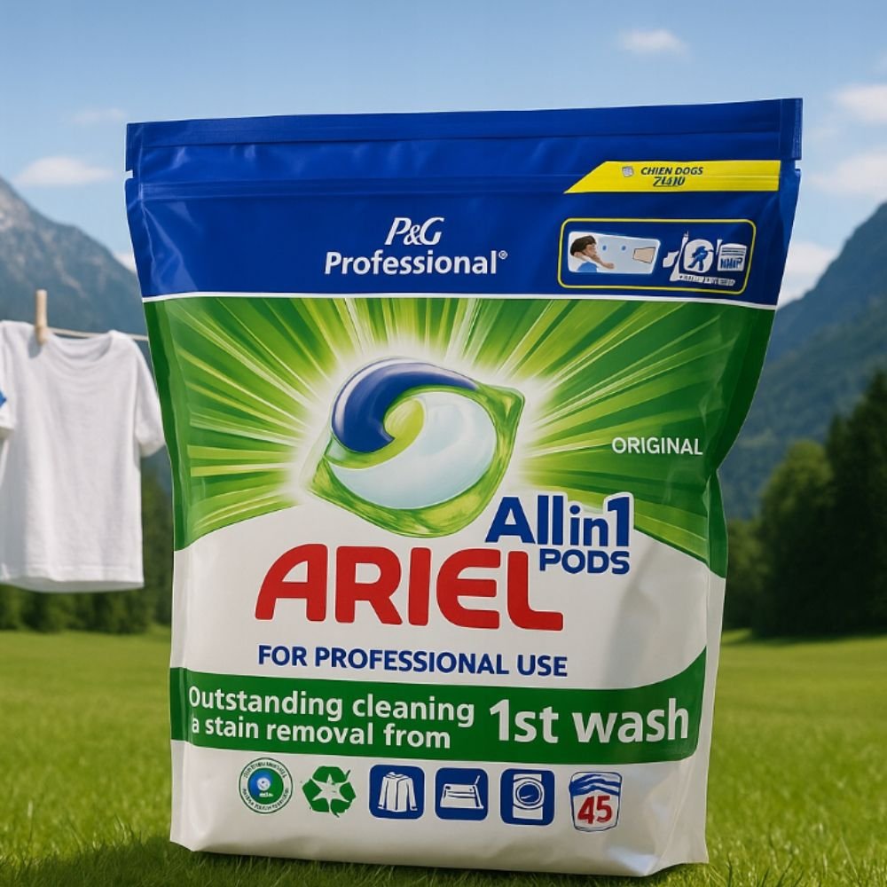 Ariel All-in-1 Pods to nowoczesne kapsułki do prania przeznaczone do użytku profesjonalnego. Zapewniają skuteczne czyszczenie i usuwanie plam już od pierwszego prania, dzięki czemu odzież i tekstylia pozostają świeże, czyste i pełne blasku.