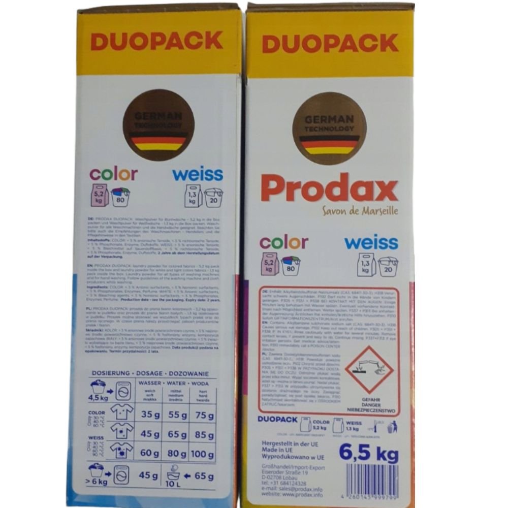 Uniwersalny oraz bardzo skuteczny Niemiecki proszek do prania PRODAX DUOPACK o pojemności 6,5 kg (5,2 Color 1,3 Weiss).