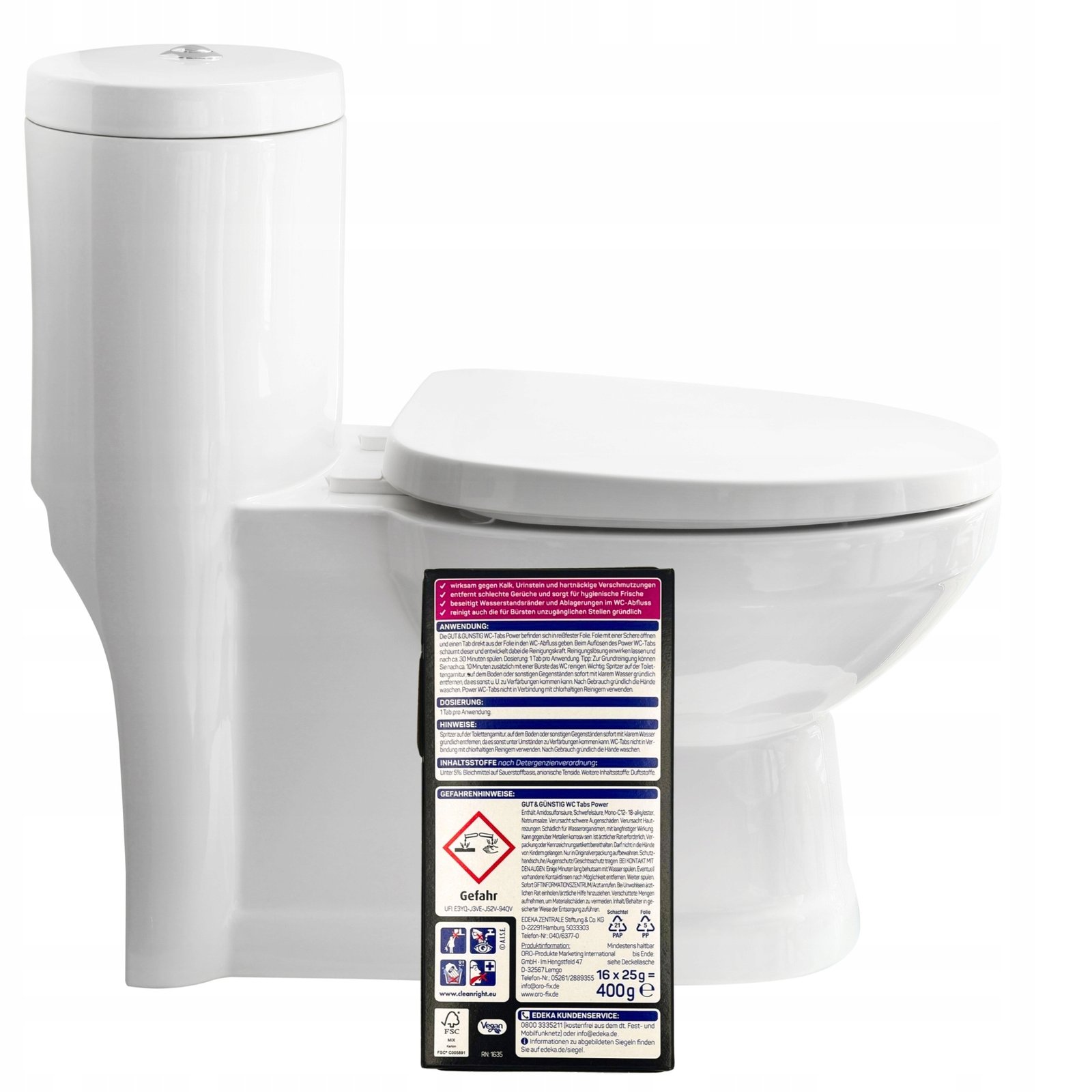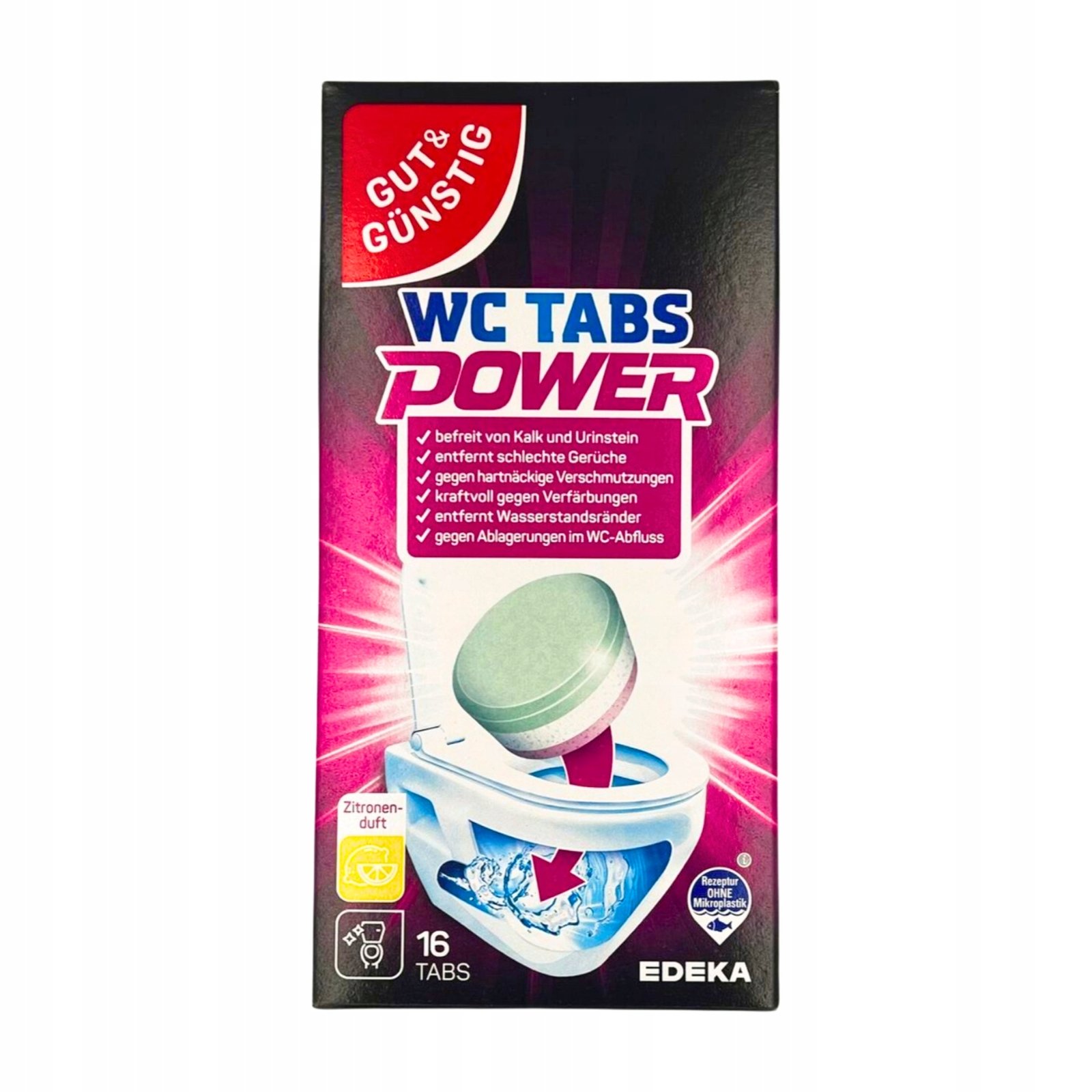 Tabletki odkamieniające G&G do WC działają poniżej poziomu linii wody, usuwają kamień, przebarwienia, rdzę i nieprzyjemne zapachy, pozostawiając muszlę lśniąco czystą i pachnącą cytrynową świeżością.